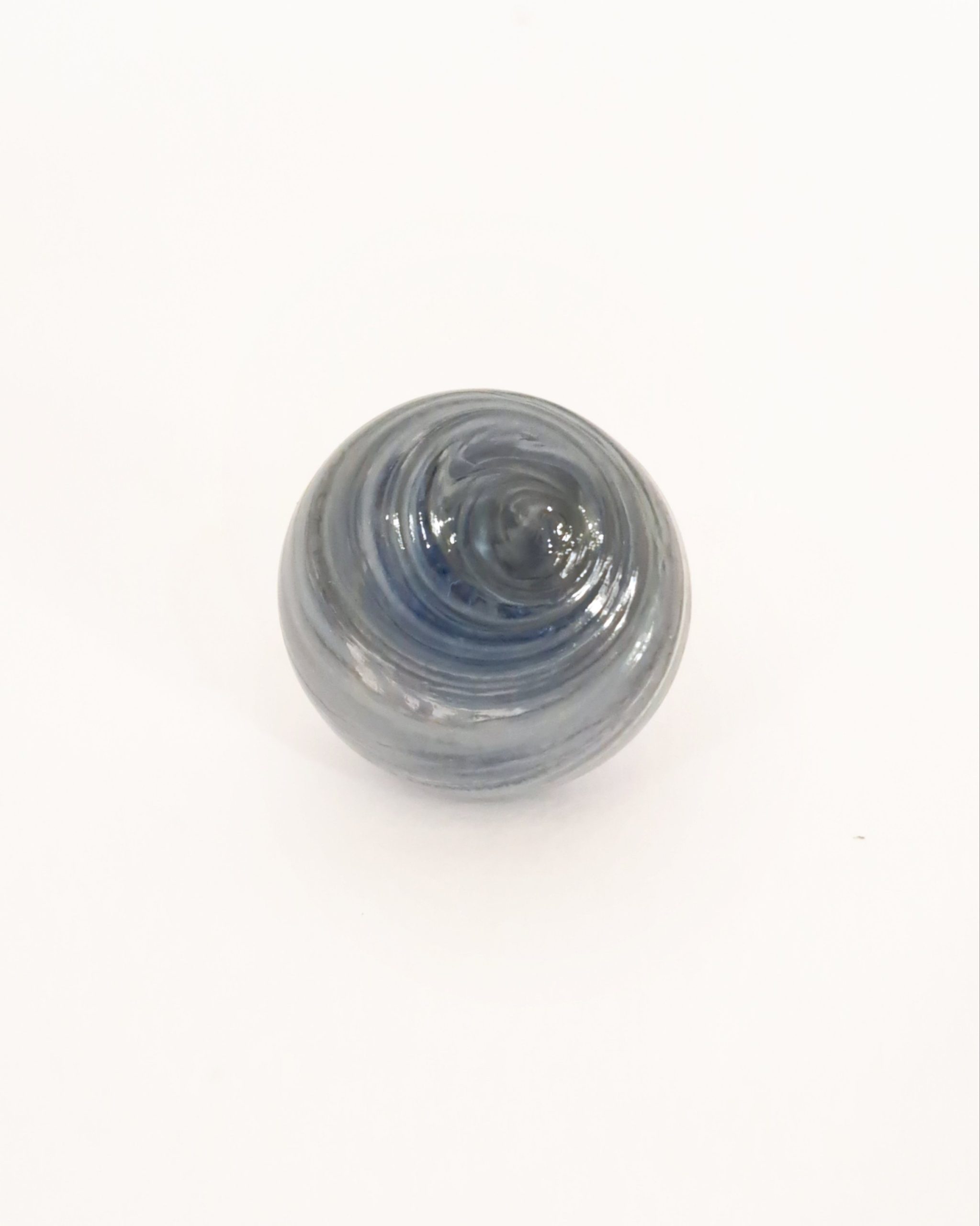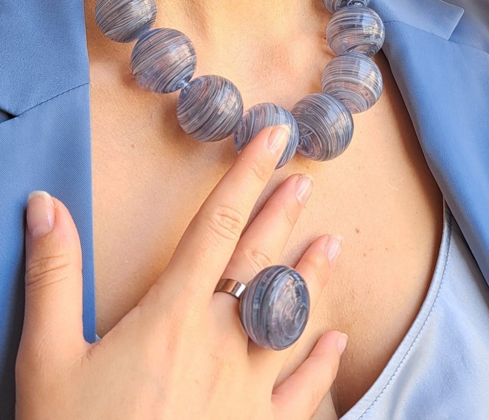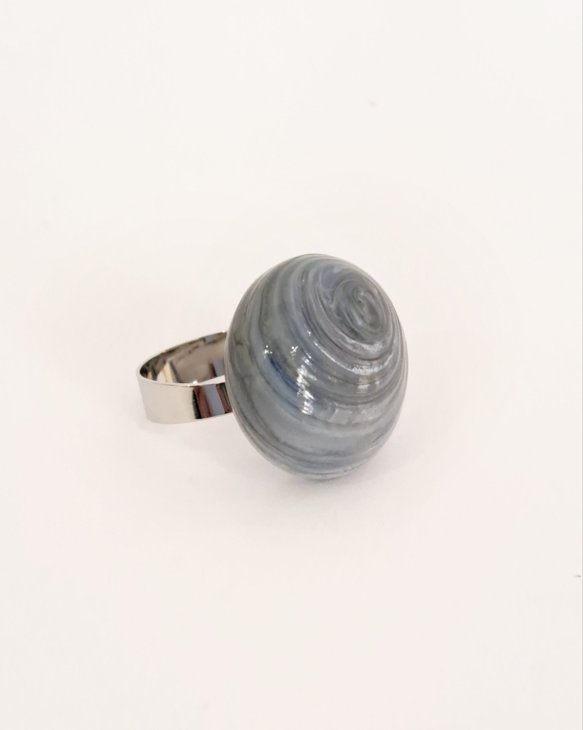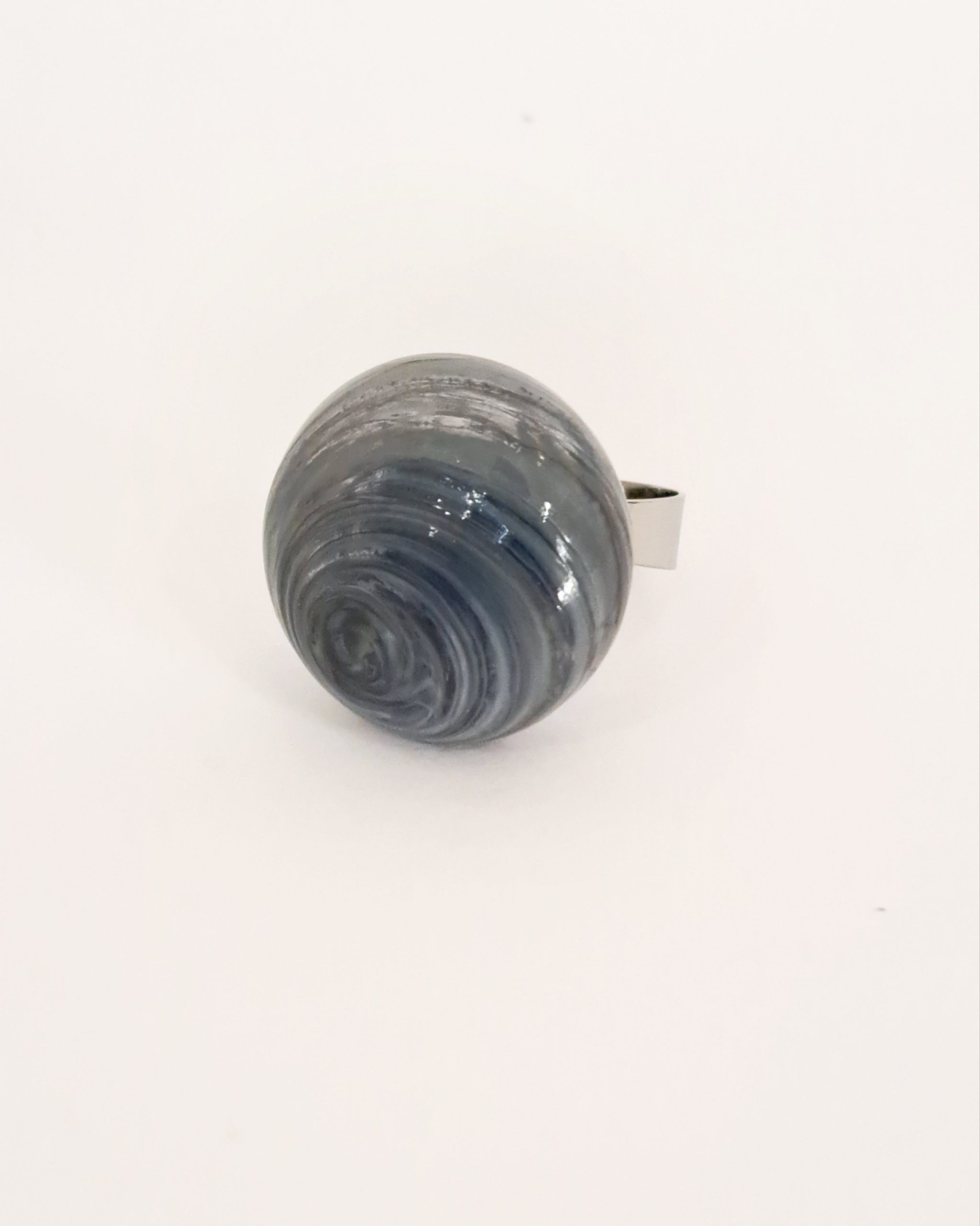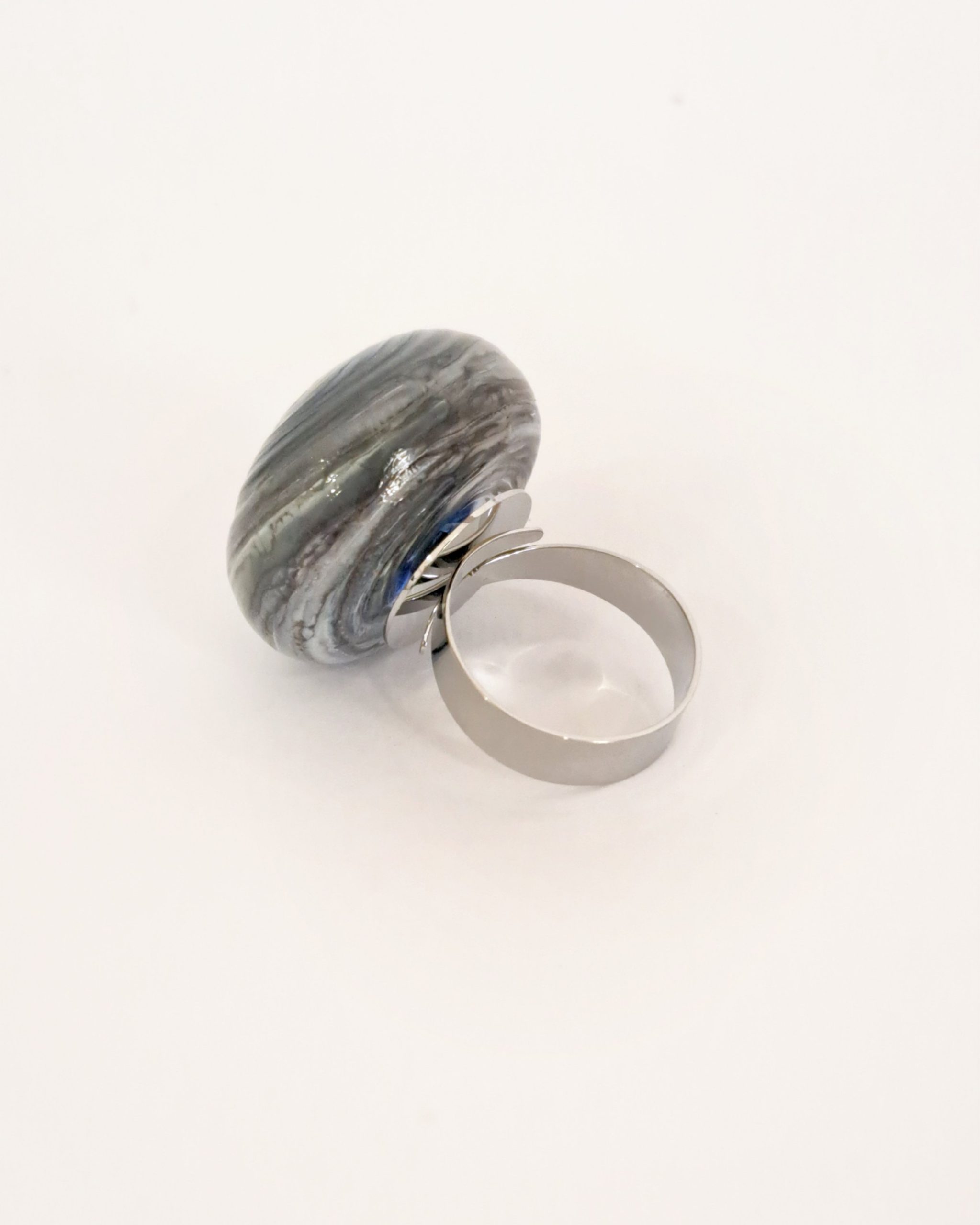 Anello con grande perla in vetro soffiato a bocca e decorato a caldo.