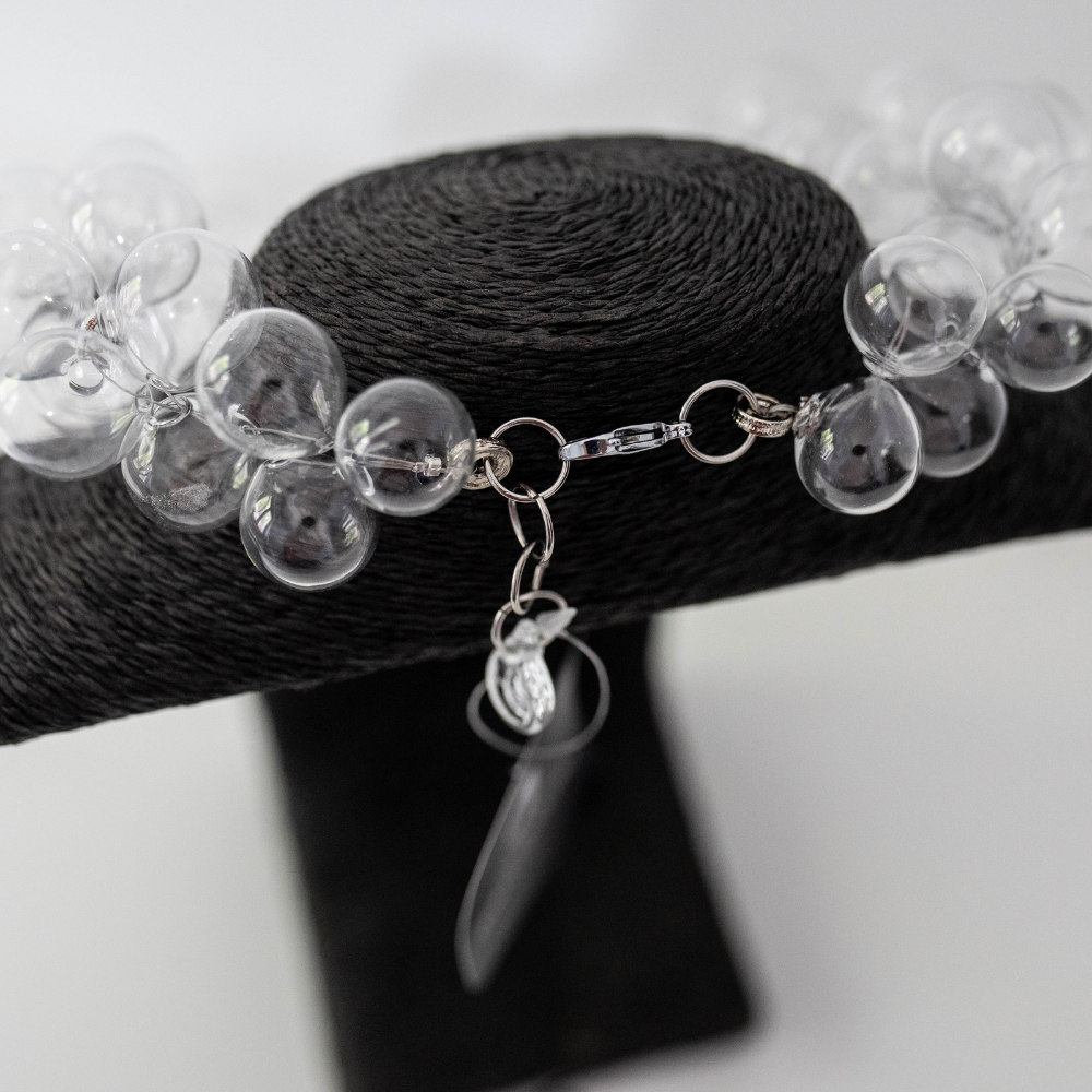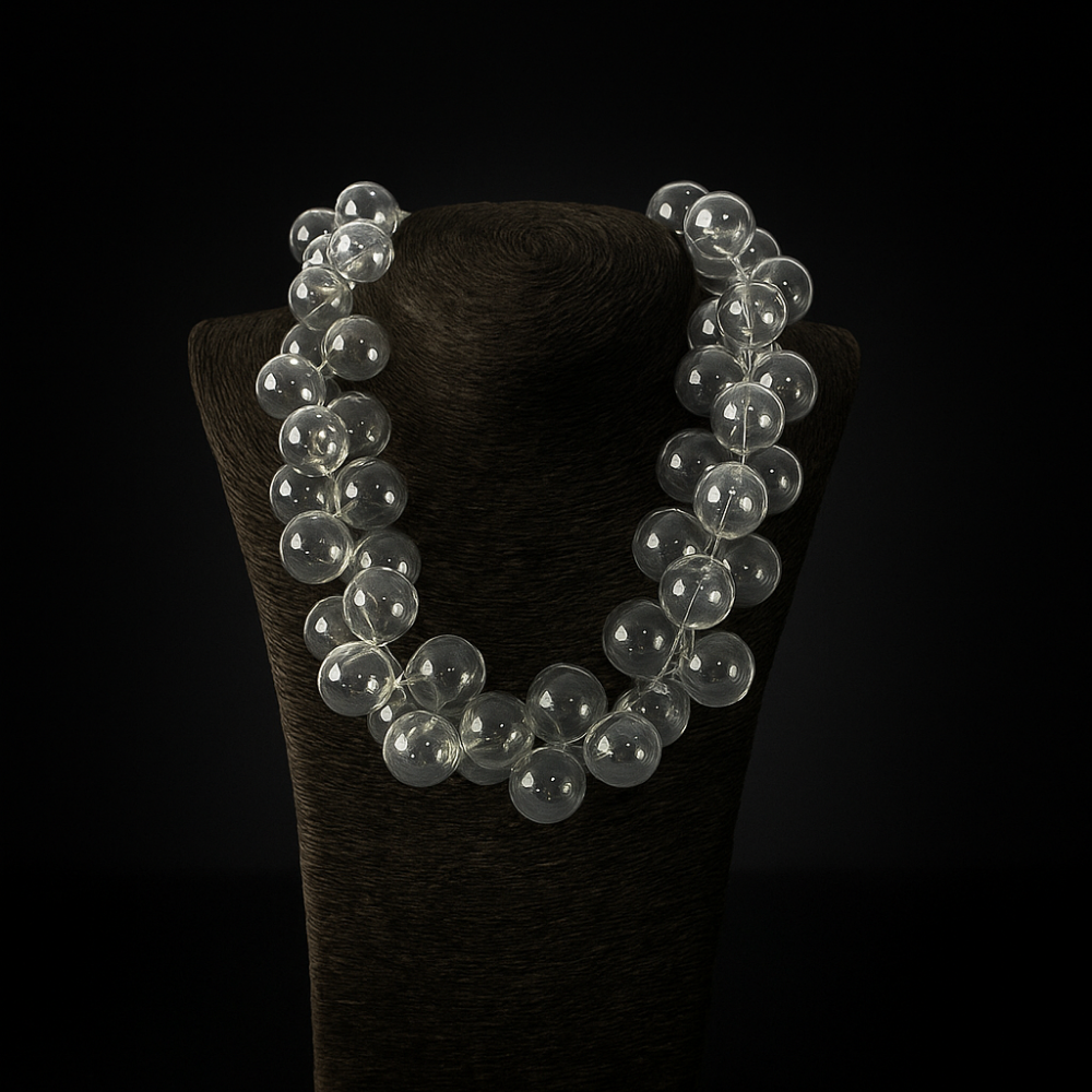 Ciò che rende questa collana ancora più straordinaria sono le sue perle trasparenti, impreziosite da delicati riflessi. Questa scelta stilistica non è casuale: conferisce al gioiello un aspetto incredibilmente leggero e quasi etereo, pur mantenendo una profondità e una ricchezza visiva che catturano immediatamente lo sguardo. È una sofisticazione che gioca con la luce, creando un’aura di mistero e fascino attorno a chi la indossa. Non è solo un accessorio, ma un punto luce che illumina il viso e l’intero outfit.