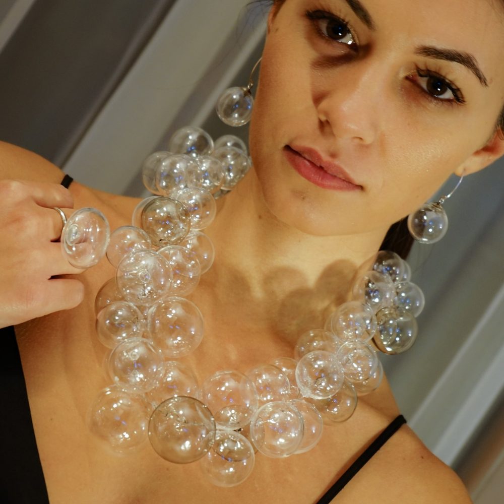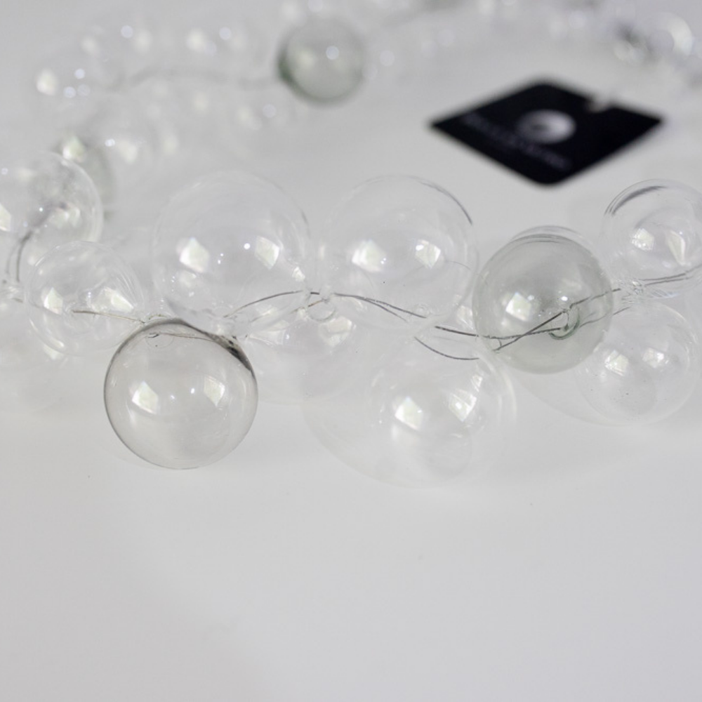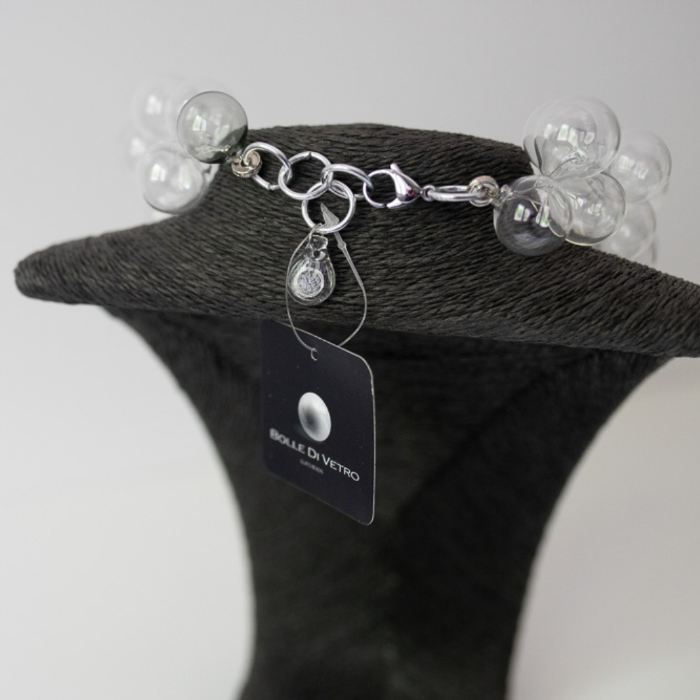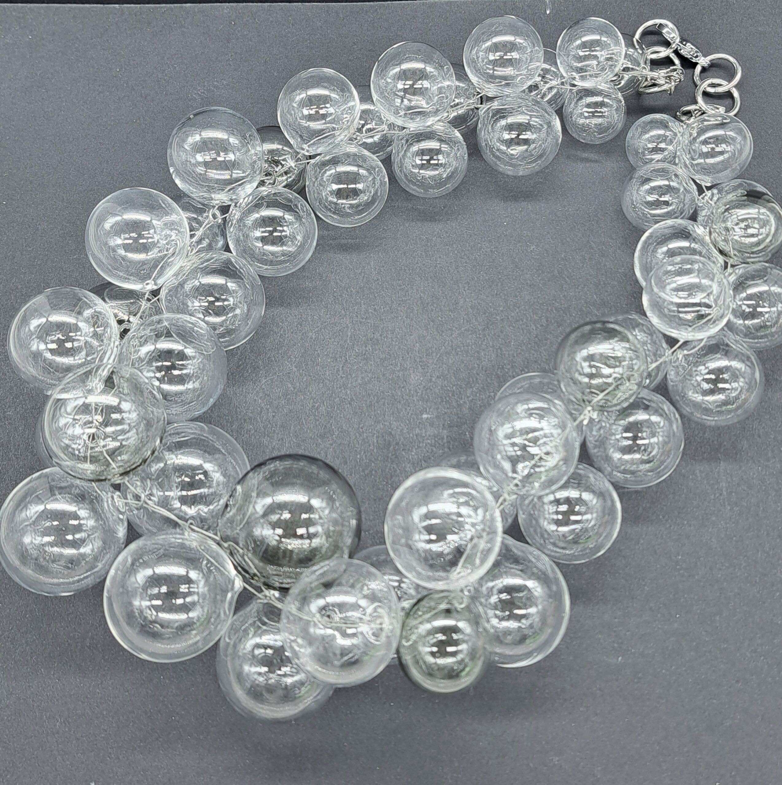 Particolarissima collana formata da circa cinquanta perle in vetro di Murano soffiato a bocca, in diverse dimensioni, nei colori cristallo e grigio chiaro.