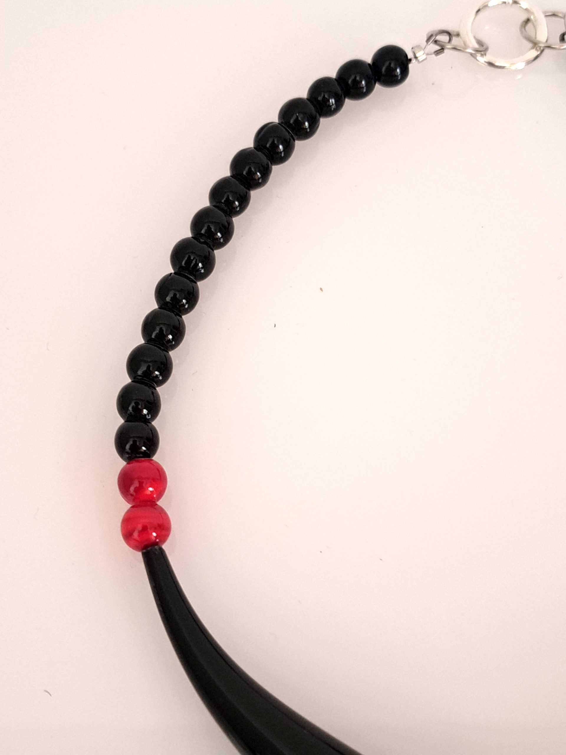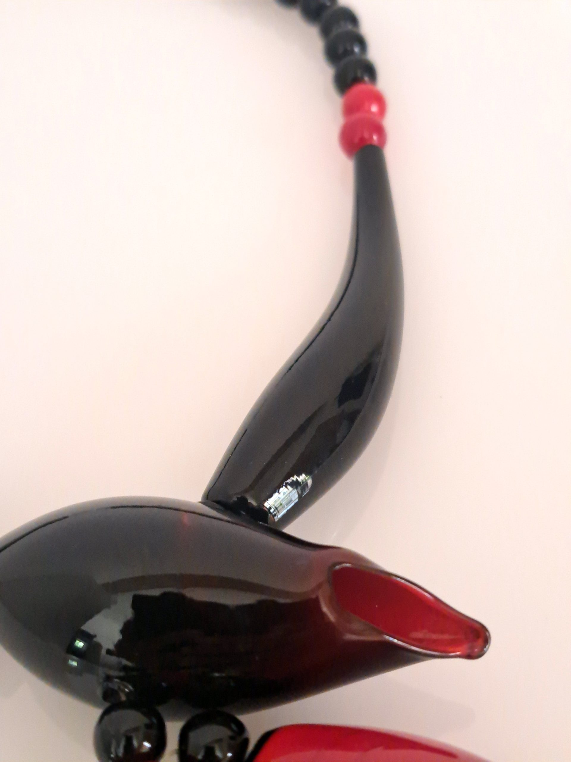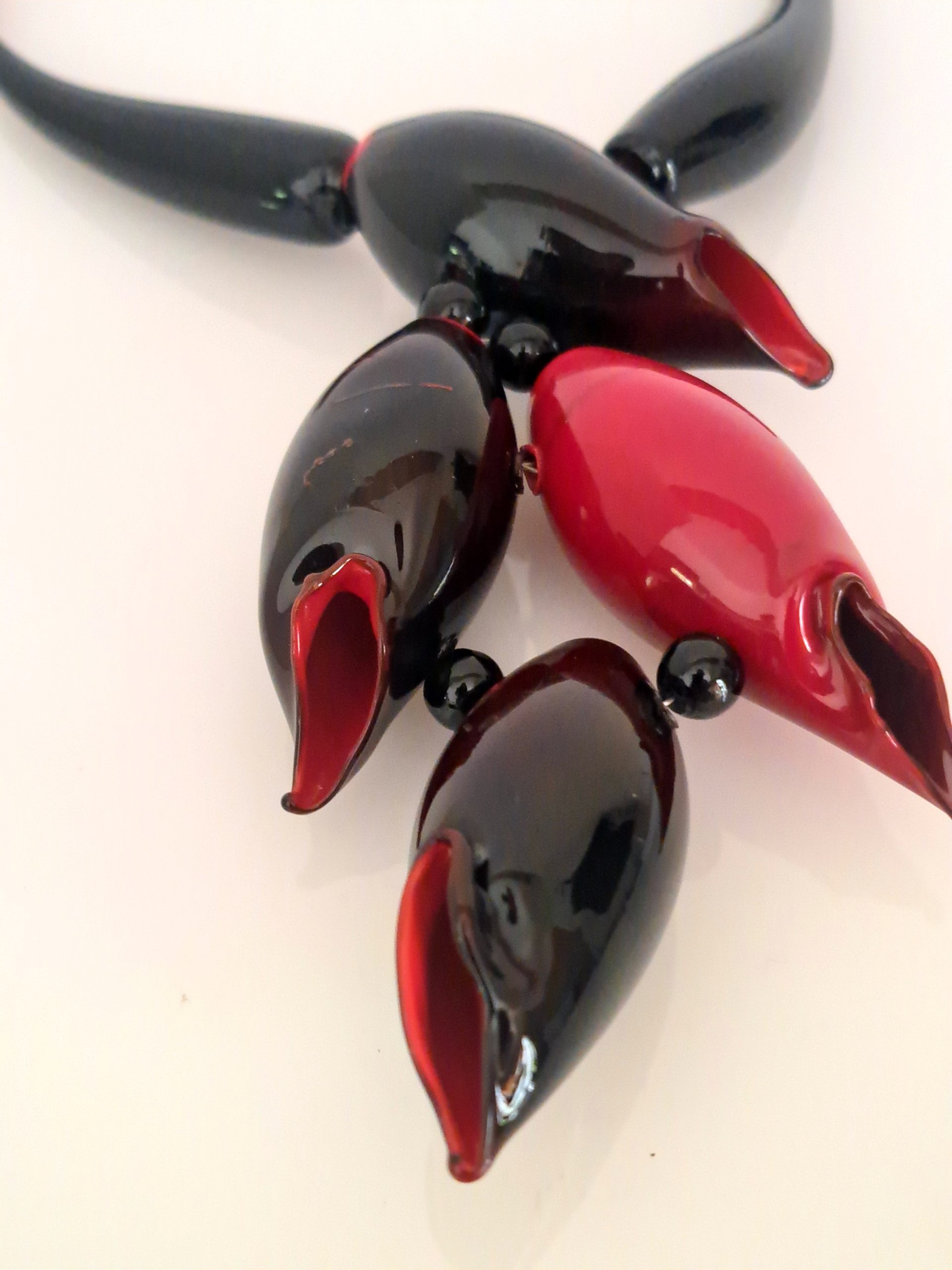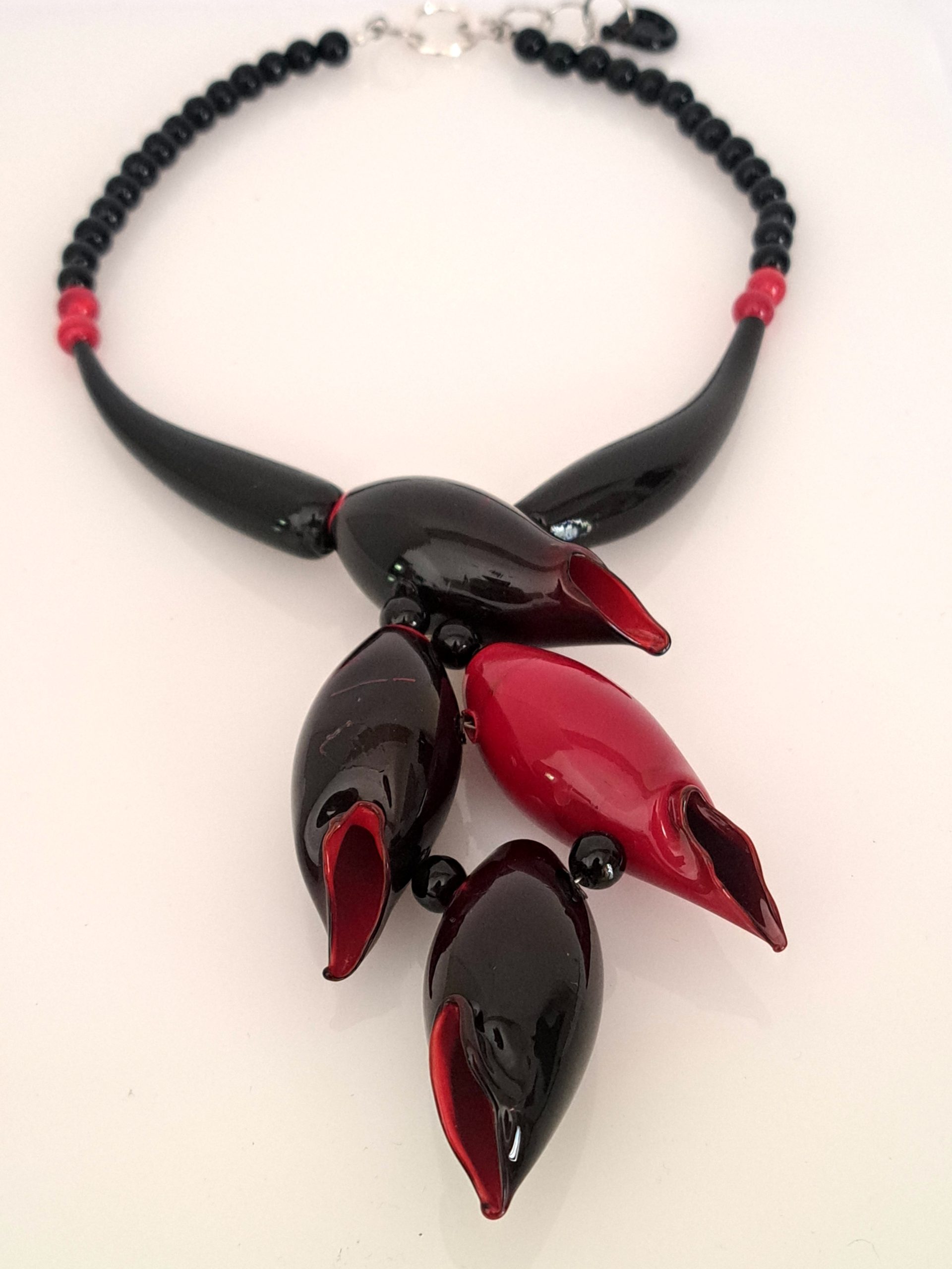 La Collana Francesca è il mio pezzo forte, un gioiello che esprime tutta la nostra dedizione e maestria artigianale. Progettata per valorizzare il décolleté, è composta da due tubi in vetro soffiato nero da cui scendono quattro fiori stilizzati: tre neri con cuore rosso e uno centrale rosso con interno nero.