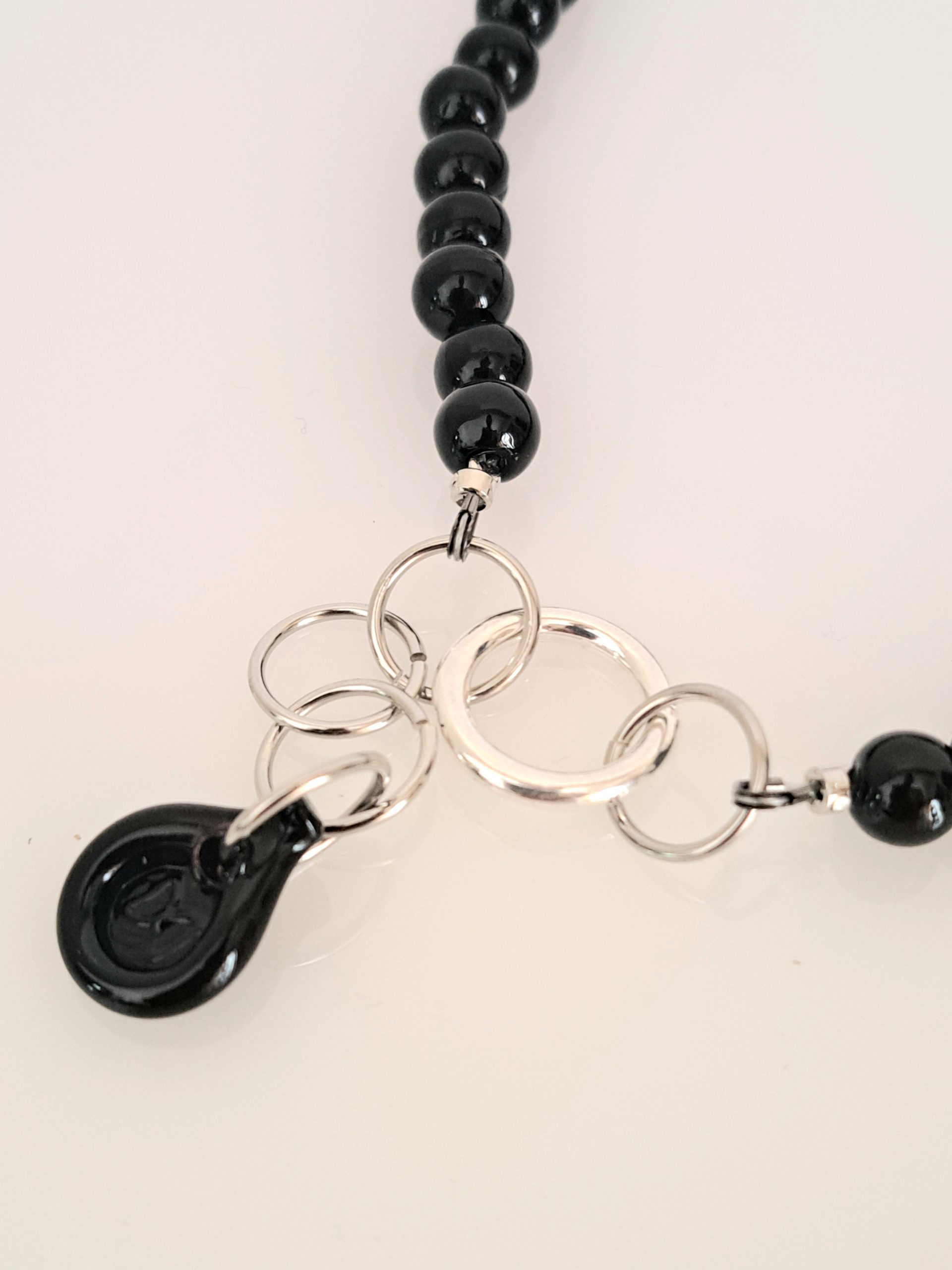 Le minuscole perle in vetro che impreziosiscono la collana si estendono fino alla chiusura posteriore, un anello minimal in argento, completando così l’intero gioiello.