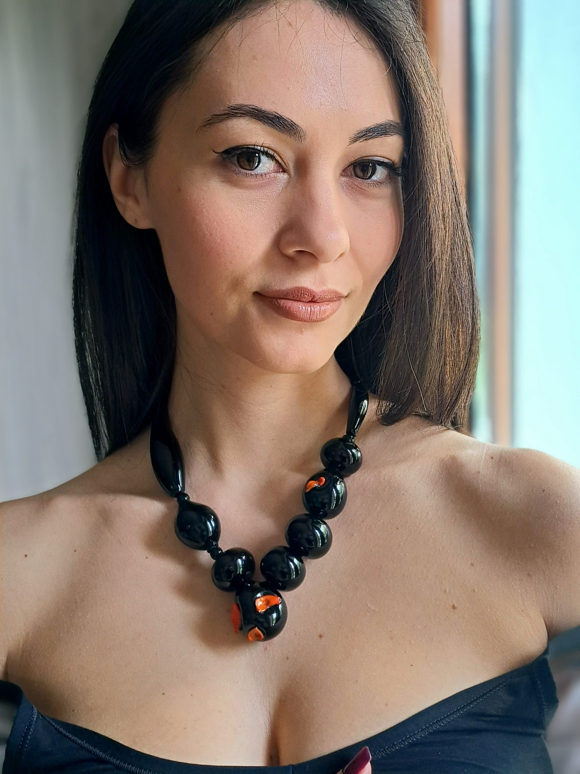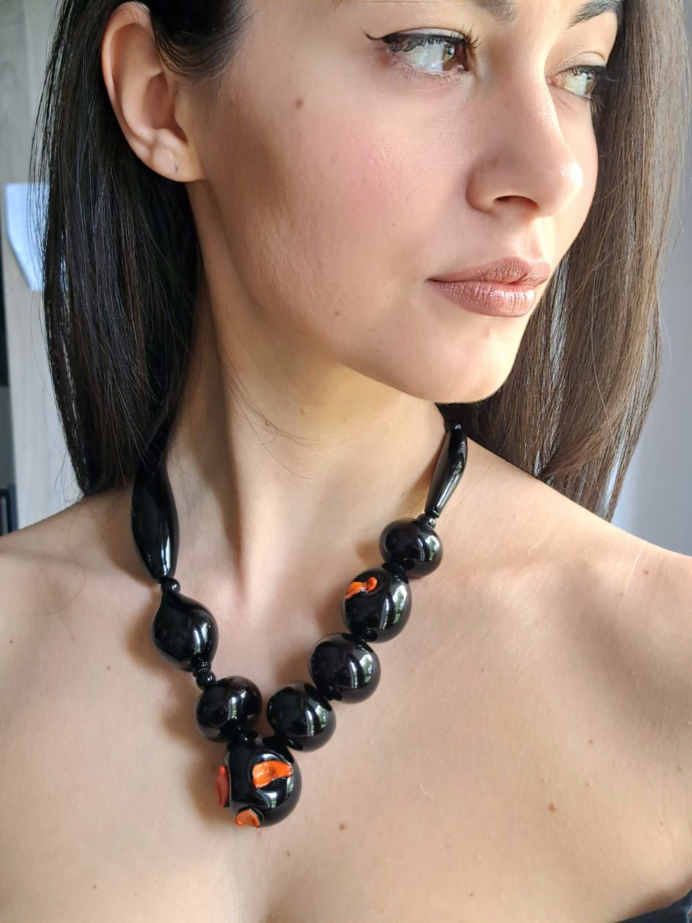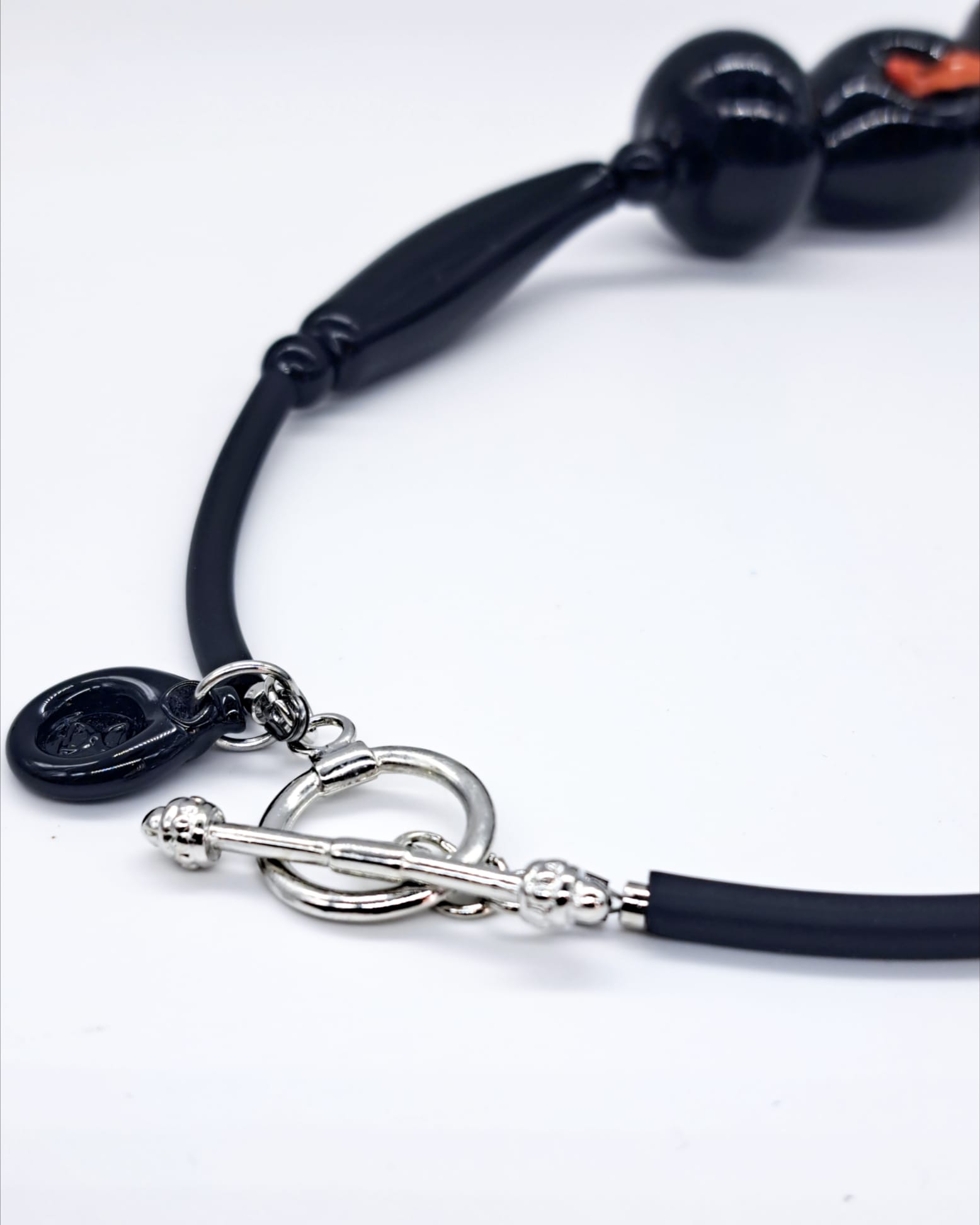 Scopri un pezzo di passione artigianale con questa collana nera in vetro soffiato, un gioiello unico nel suo genere. Ogni elemento di questa creazione è il risultato di un’attenta lavorazione, dove perle e tubi in vetro soffiato, tutti diversi per forma e dimensione, si uniscono in un’armonia perfetta.