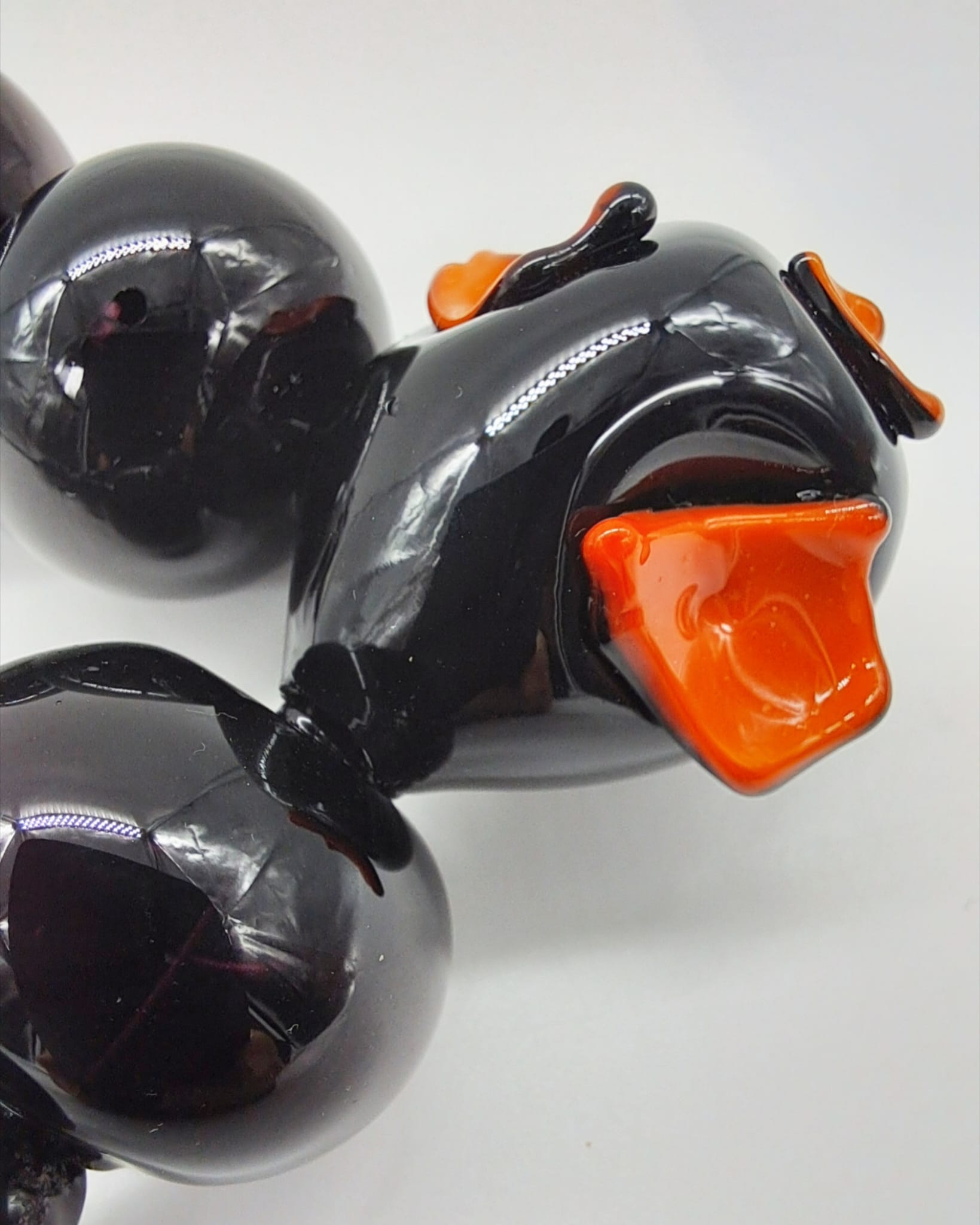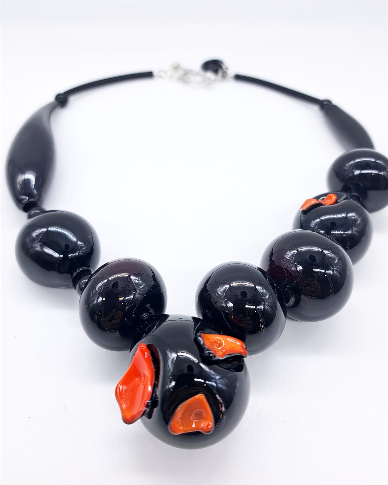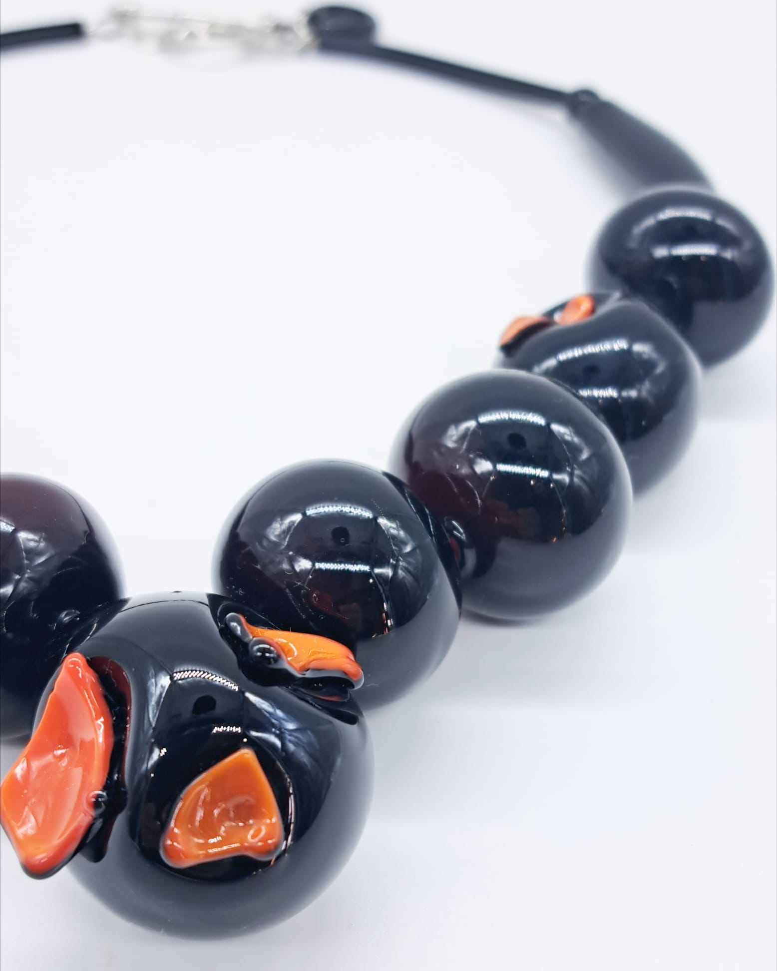 Scopri un pezzo di passione artigianale con questa collana nera in vetro soffiato, un gioiello unico nel suo genere. Ogni elemento di questa creazione è il risultato di un’attenta lavorazione, dove perle e tubi in vetro soffiato, tutti diversi per forma e dimensione, si uniscono in un’armonia perfetta.