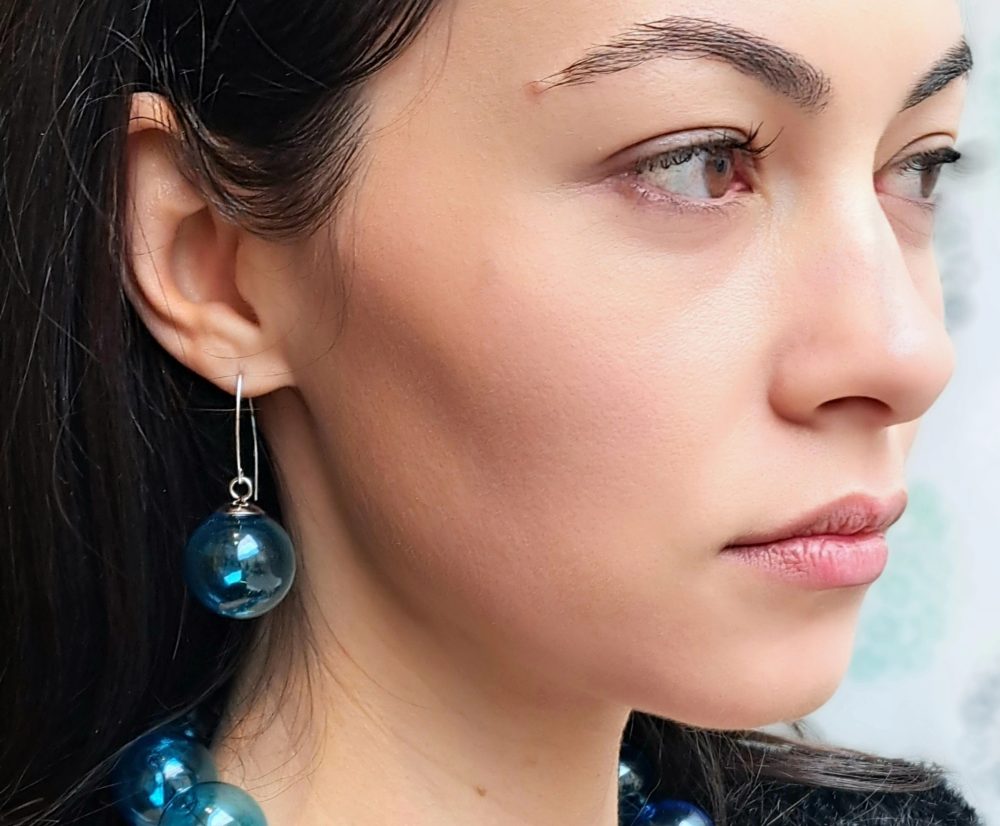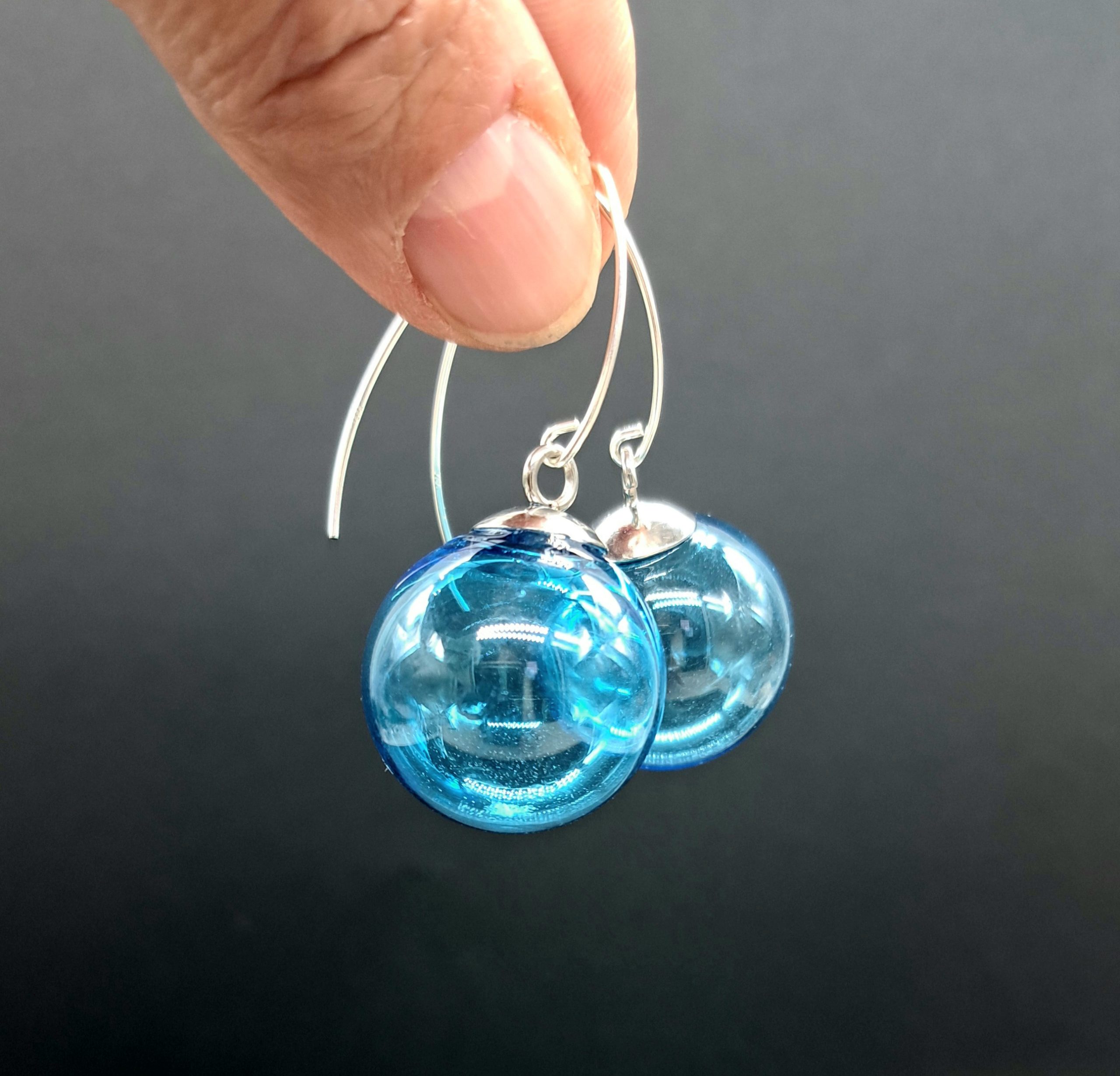 Raffinati orecchini in vetro di Murano cristallo trasparente soffiato a bocca con monachella in argento. La tecnica del vetro soffiato rende le perle leggerissime e gli orecchini confortevoli da indossare.