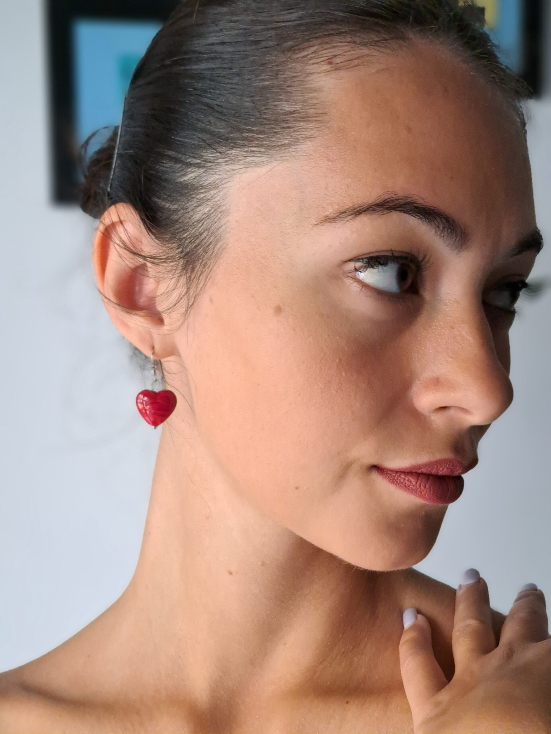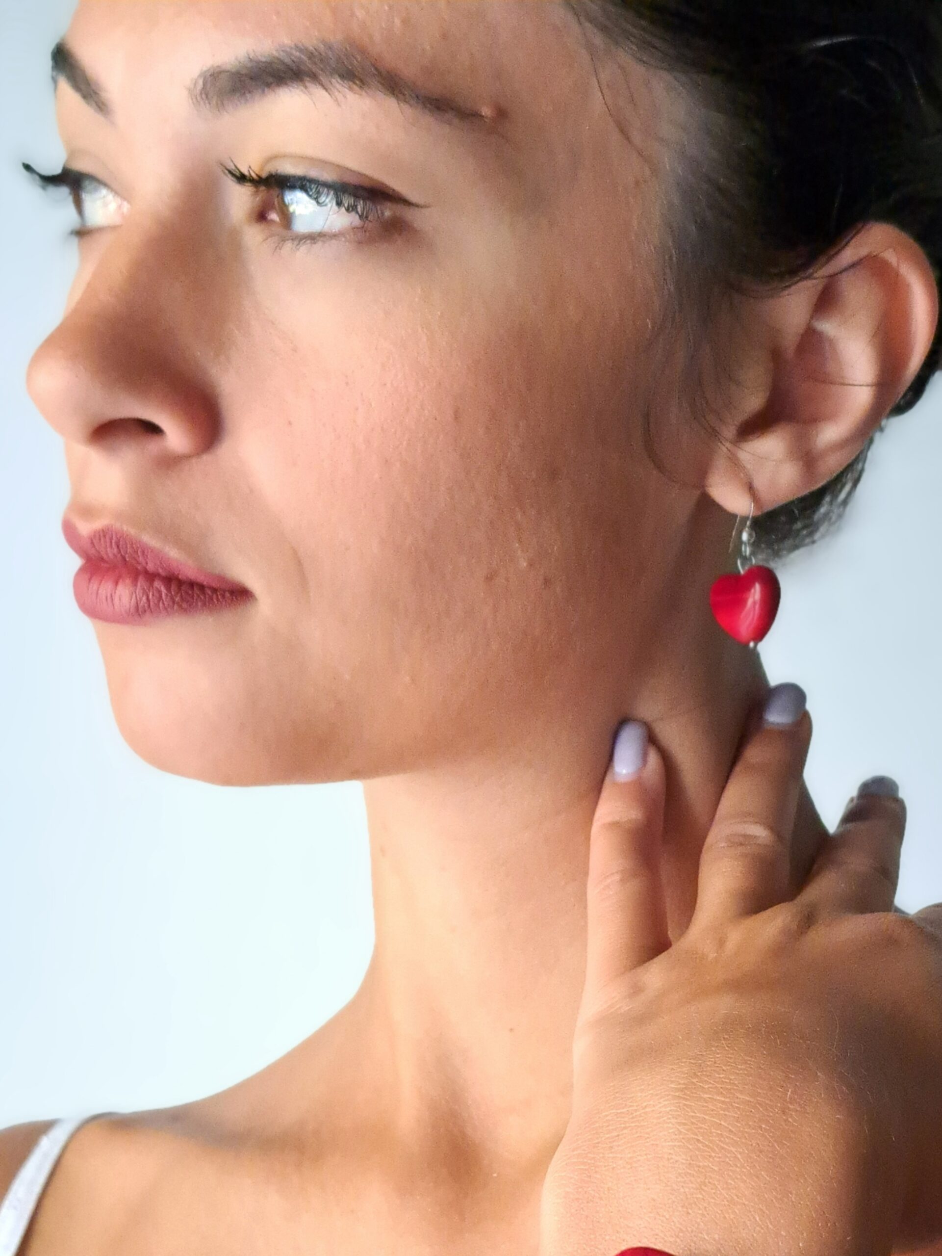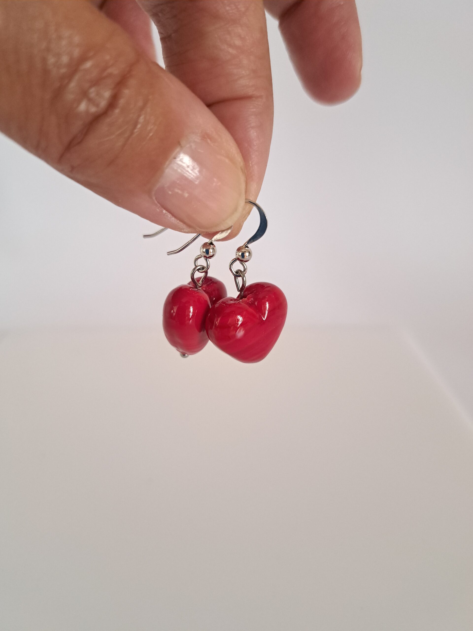 Gli orecchini “Cuori” in vetro di Murano rosso porpora, un’espressione di artigianato e design.